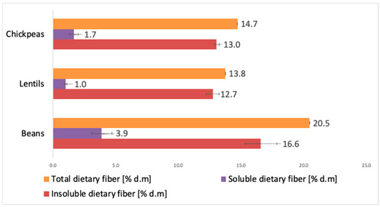 Analyses of the total fiber content in legume seeds revealed that the highest values were obtained in white beans (20.46% dry matter), followed by chickpeas (14.7%), with the lowest value found in green lentil seeds (13.75%). Additionally, the results indicated that both beans and lentils, along with chickpeas, exhibited a higher content of the insoluble fiber fraction compared with the soluble fraction.