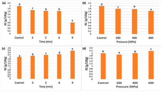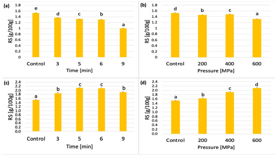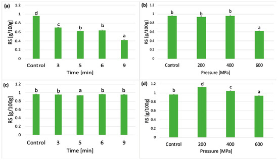 Uncooled lentil samples treated with pressure times of 3, 5, 6, and 9 min (at a constant pressure of 600 MPa) showed a statistically significant effect of pressure time (p < 0.05). All averages were different at the accepted level of significance. The lowest average RS content was characterized by the sample pressurized at 9 min (Figure 5a). On the other hand, the cooled lentil samples showed an increase in the content of mean RS values during pressurization compared with the control sample (Figure 5c). The analysis also showed a statistically significant effect of pressure of 200, 400, and 600 MPa for both cooled and uncooled samples. In uncooled samples, the average RS values were lower after applying pressures of 200, 400, and 600 MPa compared with the control sample (Figure 5b). On the other hand, for cooled samples, an increase in pressure resulted in a statistically significant increase in average RS values, and all averages differed at the accepted level of significance (p < 0.05) (Figure 5d).