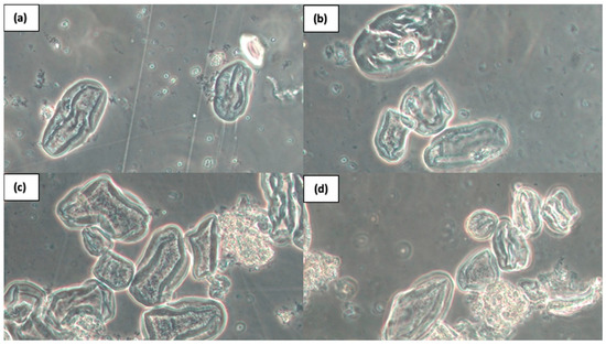 The phase contrast microscopy image (600× magnification) of chickpeas starch structure after high-pressure treatments (600 MPa). (a) Control sample—unprocessed starch; (b) 3 min; (c) 6 min; (d) 9 min.