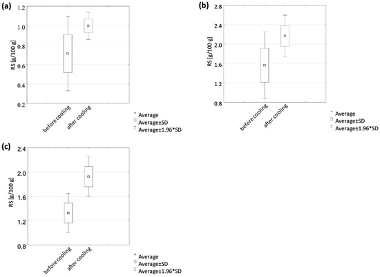 Cooling effect on RS content from averages of all tested pressures and times on bean (a), chickpea (b), and lentil (c) samples.