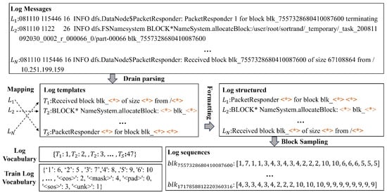 There are a number of log parsing methods, such as Spell [23], IPLoM [24], Drain [25], and so on. According to previous studies [26], weak log parsing methods can negatively affect the performance of subsequent anomaly detection tasks. Drain has become a common method used by researchers with its superior accuracy and efficiency [27,28]. Therefore, in this work, we use Drain for log message parsing. As shown in Figure 2, the HDFS dataset is used as an example. Each raw log message consists of a constant part (also known as “log keys” or “log events”) and a variable part (also known as “parameters”). The logs are first parsed into log keys using the method of Drain, then each log is mapped to its key to obtain structured logs, and finally, a vocabulary of log keys is constructed, and a log sequence is obtained by sorting the log data in time order according to the block of the log data.