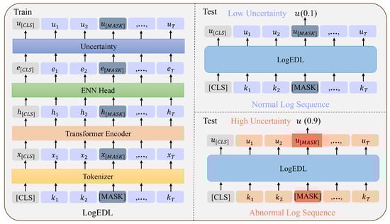 Log anomaly detection in this study can be defined as follows. Given an unstructured sequence of log messages, we aim to detect whether this sequence is normal or abnormal. We can then define the log sequence as an ordered sequence of log keys S = k 1 , , k t , , k T , where k t V represents the log key at position t, and V denotes the set of unique log keys extracted from the log messages. The goal of this task is to predict whether a new log sequence S is abnormal or not based on a training dataset D a t a s e t t r a i n = S i i = 1 N that contains only normal log sequences. To achieve this goal, LogEDL models normal log sequences and further derives an anomaly detection criterion to identify anomalous sequences. In the training phase, normal log key sequence keys are replaced by [MASK] tokens with a certain probability for network optimization; in the testing phase, the replacement is performed with the same probability to determine whether a log sequence is normal or not for the number of uncertainty log keys.