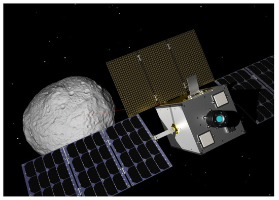 To date, CubeSats used in interplanetary missions have been designed to be transported inside a sort of main, mother, spacecraft and then released near the target celestial body. This is the case, for example, of the two pioneering (twin) CubeSats MarCO-A and MarCO-B, the more recent LICIACube, and the upcoming Milani and Juventas. The next step in the practical employment of CubeSats in deep space scientific missions is, therefore, the use of an own propulsion system to perform the entire (or a consistent part of the) interplanetary transfer required to reach the target solar system’s body or the target heliocentric orbit. In this context, the proposed ESA’s The Miniaturised Asteroid Remote Geophysical Observer (M-ARGO) mission can be considered a milestone in the use of CubeSats for the solar system’s scientific exploration [17,18]. In fact, the M-ARGO demonstration mission, whose launch is currently scheduled for 2026, will use the electric propulsion system installed on board a 12U CubeSat (parked at the Sun–Earth collinear Lagrangian point ) to trace a heliocentric trajectory that will achieve a rendezvous with a small and rapidly spinning (near-Earth) asteroid. The latter has yet to be selected in a set of recently identified targets as discussed in the interesting work by Franzese et al. [19]. The (continuous-thrust) miniaturized electric thruster (i.e., a single radiofrequency gridded ion thruster) is one of the CubeSat advanced subsystems [20] as, for example, a multispectral camera and a laser altimeter, which will be used to obtain the in situ observation of the target celestial body, or the flat-panel antenna (also called “reflectarray” [21,22,23]) for deep space communications. Figure 1 shows an artistic concept of the CubeSat M-ARGO approaching a potential target asteroid.