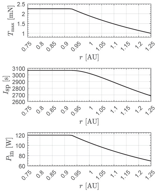 The thruster input power depends on the spacecraft solar panels power output that, in its turn, can be approximately considered a function of the Sun–spacecraft distance r as analyzed in refs. [26,27] by using a simplified model for the performance of the power subsystem unit in a typical interplanetary transfer, which is derived from the more refined model proposed by Sauer [28,29]. In this context, Equation (3) of ref. [18] provides a useful polynomial formula that directly expresses the power absorbed by the electric thruster as a function of the solar distance . That formula, in fact, bypasses the introduction of a mathematical model for the solar panels performance as a function of both the Sun–spacecraft distance and the flight time [30]. In this case, the simplified function proposed by ref. [18], which refines the classical relationship , can be written in a compact form as