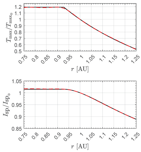 The accuracy of Equations (12) and (14) in approximating the expressions of the MTC surrogate thrust model given by Equations (1) and (3) is confirmed by Figure 4, which shows that the proposed model substantially gives a thrust (and specific impulse) variation with the solar distance, which is superimposed with the results illustrated in ref. [18].