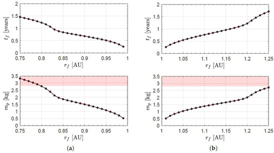 Results of the optimization process in a circle-to-circle coplanar MTC orbit transfer without constraints on the propellant mass, in terms of the minimum flight time and propellant mass as a function of the target orbit radius . The light red region indicates the zone in which the condition on the maximum value of the admissible propellant mass is violated (). (a) Case of orbit lowering; (b) case of orbit raising.