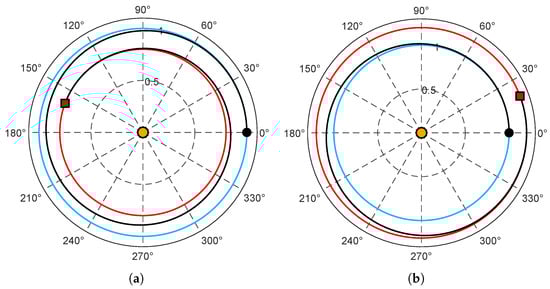 Optimal circle-to-circle coplanar orbit transfer of a MTC when the radius of the parking orbit is . Radial distances are in astronomical units. Black line → rapid transfer trajectory; blue line → parking circular orbit; red line → target circular orbit; black circle → start point; red square → arrival point; orange circle → the Sun. (a) Case of an orbit lowering with ; (b) case of an orbit raising with .