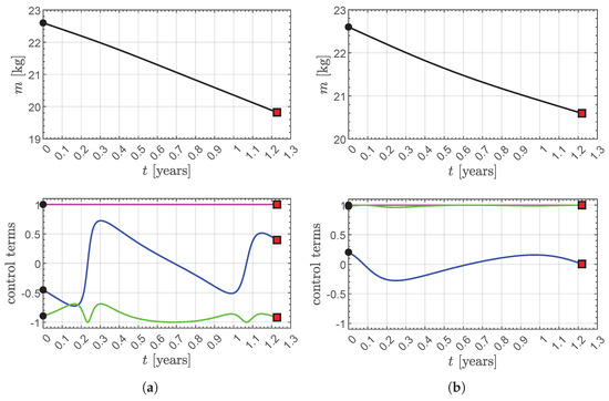Variation with time t in the spacecraft total mass m and the control terms . Black line →m; magenta line →; blue line →; green line →; black circle → start point; red square → arrival point. (a) Case of an orbit lowering with ; (b) case of an orbit raising with .