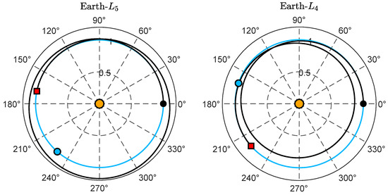 The mathematical model discussed in the last section can be used to obtain the (constrained) minimum flight time of a MTC in a transfer towards one of the two Sun–Earth triangular Lagrangian points . The latter are approximately located at a distance of from both the Earth and the Sun (see Figure 11) so that a transfer of a MTC towards point (or point ) can be approximated with a phasing ahead (or behind) maneuver of an angle (or ) along a circular heliocentric orbit with radius .