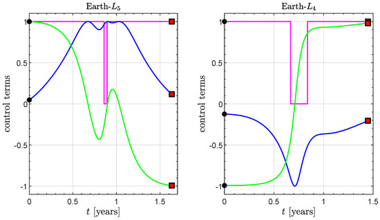 Variation in the control terms with time t in a MTC transfer towards the Sun–Earth triangular Lagrangian points or . Magenta line →; blue line →; green line →; black circle → start point; red square → arrival point.