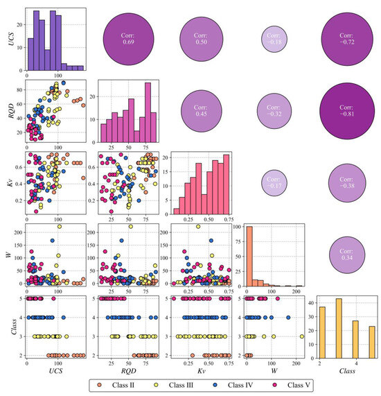 Ultimately, a database was created with four input parameters (UCS, RQD, Kv, and W) and one output parameter (rock mass classification). Table 1 provides the statistical descriptions of the four rock mass classifications. As shown in Table 1, as the rock mass classification increases, the values of UCS and RQD decrease, indicating a negative correlation between UCS, RQD, and rock mass classification. The numbers of cases for each rock mass classification in the database are: class II with 37 cases (28.5%), class III with 43 cases (33.1%), class IV with 27 cases (20.8%), and class V with 23 cases (17.7%), indicating an imbalance in the database. Additionally, the correlation matrix of the rock mass classification data in Figure 2 can be used to analyze the correlation and distribution relationships between the data. It is evident that UCS and RQD are strongly correlated with rock mass classification. The scatter plot distribution shows that the range of input parameters is broad, effectively covering the rock mass quality conditions in underground engineering, further demonstrating the reliability and comprehensiveness of the database.