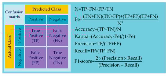 Performance evaluation is a critical aspect of the model-building process [25]. By utilizing appropriate evaluation methods, the strengths and weaknesses of the model can be understood, ensuring its robust generalization ability in rock mass classification prediction. This study utilized various evaluation metrics, including accuracy, Kappa, precision, recall, and F1-score. Accuracy measures the proportion of correct classifications overall but has limitations in imbalanced datasets. The Kappa accounts for random guessing, providing an adjusted standard for evaluating accuracy. Precision reflects the model’s accuracy in predicting positive classes, while recall measures the model’s comprehensiveness in detecting positive classes. The F1-score combines precision and recall, offering a balanced metric, particularly useful in cases of category imbalance. The calculation of these evaluation indicators is illustrated in Figure 3. The comprehensive use of these evaluation metrics aids in fully understanding the model’s performance, thereby better guiding its optimization and improvement.