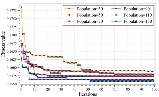 In the process of optimizing the model hyperparameters using ZOA, population size and the number of iterations are critical parameters. Population size determines the number of zebra individuals in each generation, while the number of iterations represents the total generations executed by the algorithm. A larger population size can enhance the global search capability but also increase computational cost; conversely, a smaller population size may lead the algorithm to fall into local optima. Thus, a balance between global exploration and computational cost is essential. The choice of iteration number depends on the problem’s complexity and computational resource constraints. Generally, more iterations allow the algorithm to find better solutions, but excessive iterations may increase computation time and degrade convergence performance. After multiple tests, six population sizes (30, 50, 70, 90, 110, and 130) were finally set, and XGBoost was trained through 100 iterations. It is worth noting that the selection of the number of iterations considered the variations in the accuracy of the model. Initially, the iteration count was set to 50 and it was incrementally increased to assess its impact on model accuracy. As the iteration count increased, the accuracy improved and eventually stabilized. To balance accuracy with computational efficiency, the iteration count was set to 100. Before optimization, the fitness function needs to be defined. The cross-entropy loss function, widely used in classification tasks, measures the difference between the predicted probabilities of each class and the actual labels. The lower the cross-entropy loss, the higher the model’s predicted probability for the true class. The iteration convergence graph of the ZOA-XGBoost model is shown in Figure 4. As the number of iterations increases, the fitness values of different populations decrease, and the models with different population sizes achieve the lowest loss at the end of optimization. The larger the population size, the faster the model converges. Around the 45th iteration, the fitness values of all models stabilize, reaching the optimal state of optimization.