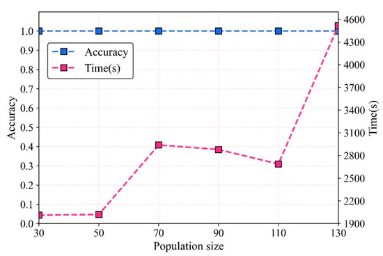 After completing ZOA-XGBoost training, the optimal hyperparameters and training time corresponding to different population sizes were obtained. The optimal hyperparameters for different models are shown in Table 3. The training accuracy and training time of the various models are illustrated in Figure 5. Typically, the optimal population size is determined by the lowest cross-entropy loss value. Figure 4 shows that the loss value of the model decreases as the population size increases. The model with a population size of 130 has the lowest loss value in 100 iterations. However, this study also considered training time in the model evaluation. When models have similar predictive performance on the same dataset, those with shorter training times are preferable. Figure 5 shows that the ZOA-XGBoost models achieve an accuracy of 1 across different population sizes, indicating excellent predictive performance during training. It can also be observed that the model with a population size of 30 has the shortest training time, thus making it the optimal ZOA-XGBoost model.