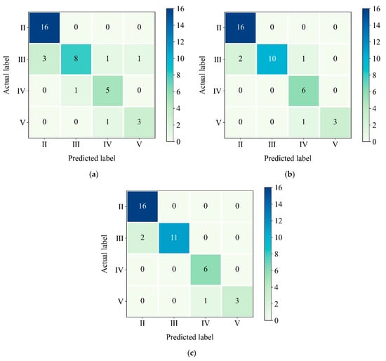 Confusion matrix of models during the testing phase: (a) XGBoost; (b) BO -XGBoost; (c) ZOA-XGBoost.