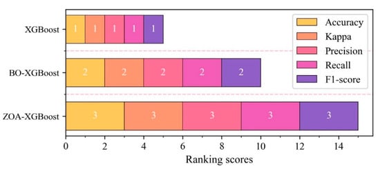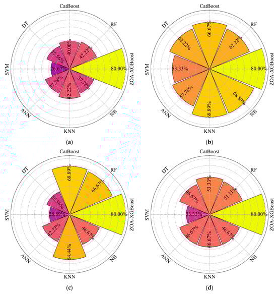 Figure 12 presents the performance comparison of the different models on the incomplete dataset. As shown in Figure 12a, the ZOA-XGBoost model achieves an accuracy of 80.00% directly on the dataset with missing values, significantly outperforming other models after imputation. The accuracy of other models is relatively low when missing values are filled with 0. Figure 12b shows the performance when missing values were filled with the mean of the training set. Although the performance of other models improves, ZOA-XGBoost remains the best performer. Figure 12c illustrates the results when missing values were filled with the median. RF, CatBoost, and KNN demonstrate more stable performance compared to other models but still lag behind ZOA-XGBoost. Figure 12d shows the performance when missing values were filled with the mode. While other models demonstrate more balanced performance after mode imputation, they still do not match the performance of ZOA-XGBoost overall.