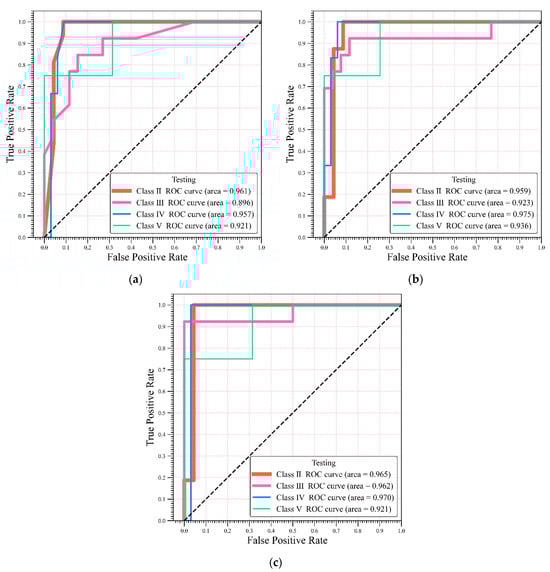 Confusion matrices for each model on the test set were established, as shown in Figure 7. A confusion matrix is a table where rows represent actual classes and columns represent predicted classes. From the figure, it is evident that all models achieve a perfect prediction for class II, with a value of 16. The unoptimized XGBoost performs poorly on class III, misclassifying four instances. After optimization, both BO-XGBoost and ZOA-XGBoost improve the correct classification numbers for classes III and IV. Various evaluation metrics calculated from the confusion matrix are presented in Table 4. The unoptimized XGBoost shows the poorest predictive performance, with the following metrics: Accuracy of 0.821, Kappa of 0.738, Precision of 0.829, Recall of 0.821, and F1-score of 0.813. The optimized models exhibit better predictive performance. Specifically, ZOA-XGBoost significantly outperforms the unoptimized XGBoost model across multiple performance metrics, highlighting ZOA’s advantage in hyperparameter tuning. The metrics for ZOA-XGBoost are Accuracy of 0.923, Kappa of 0.887, Precision of 0.932, Recall of 0.932, and F1-score of 0.922. BO also enhances XGBoost’s predictive performance, albeit slightly less than ZOA-XGBoost, but still significantly better than the unoptimized model. The metrics for BO-XGBoost are Accuracy of 0.897, Kappa of 0.850, Precision of 0.916, Recall of 0.897, and F1-score of 0.896. These results indicate that BO is also effective in selecting XGBoost hyperparameters and significantly improving model performance. Figure 8 visually presents the evaluation metric scores for the three models on the test set. It is evident that ZOA-XGBoost achieves the highest score, demonstrating superior predictive performance. The performance ranking of the models is as follows: ZOA-XGBoost > BO-XGBoost > XGBoost. Additionally, Figure 9 illustrates the receiver operating characteristic (ROC) curves and the area under the ROC curve (AUC) values for each model across different classes. The closer the ROC curve is to the top left corner, the better the model’s performance. Based on the curve distribution and AUC values, ZOA-XGBoost still exhibits the best performance, providing superior predictions for rock mass classification.