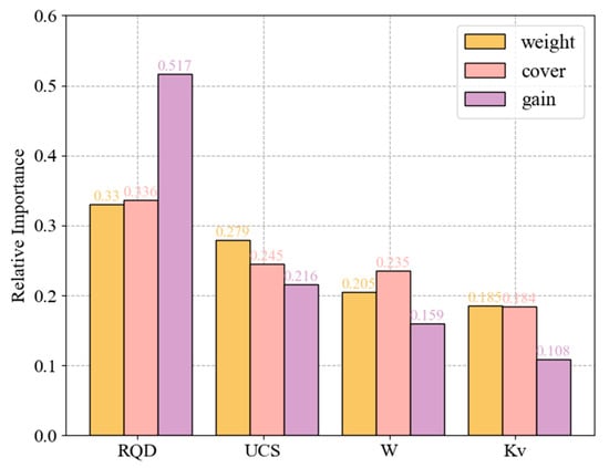 XGBoost provides various methods for evaluating feature importance, including weight-based, cover-based, and gain-based approaches. The weight-based method calculates the number of times a feature is used to split the data across all decision trees. The more frequently a feature appears at split points, the higher its weight. The cover method measures the number of training data instances that pass through split points using a particular feature, reflecting the feature’s prevalence in the model. Gain indicates the average reduction in training loss when a feature is used for splitting, directly reflecting its contribution to model accuracy. Analyzing feature importance through multiple methods offers a comprehensive understanding of each feature’s contribution to the model. As shown in Figure 10, RQD stands out in all three methods, particularly in gain (0.517), indicating its significant role in improving model performance. UCS and W also show high importance, consistently contributing across all methods, while Kv has relatively lower importance. The feature importance analysis ranks the features as follows: RQD > UCS > W > Kv.