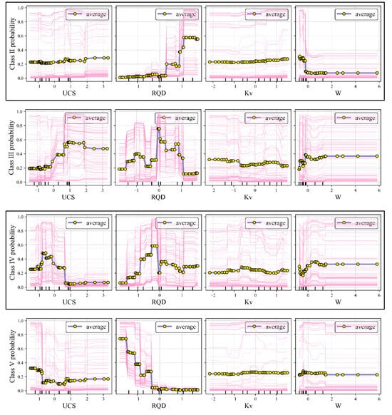 To determine the impact of features on rock mass quality prediction, individual conditional expectation (ICE) plots were used for detailed analysis of each feature [27], as shown in Figure 11. ICE plots illustrate the effect and direction of a single feature’s change on rock mass quality prediction, holding other feature values constant. The pink lines represent the prediction changes of individual instances, while the purple lines show the average prediction changes for all instances. The figure reveals that as RQD increases, particularly in the higher RQD range, the prediction probability for class II rises significantly, while it decreases for class V. At low RQD values, the probability for class III is low, but it increases markedly as RQD grows, indicating that mid to high RQD values favor class III predictions. Similarly, mid to low RQD values support class IV predictions, highlighting RQD’s critical impact on rock mass quality prediction, with higher RQD values indicating better rock mass quality. UCS also significantly impacts prediction probability, showing trends similar to RQD for classes III, IV, and V. However, changes in UCS have a smaller effect on class II predictions. The relatively flat lines in the ICE plot for Kv suggest its limited contribution to rock mass classification predictions, whereas W has a slightly higher influence than Kv.