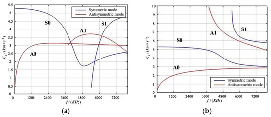 In the equation , represents the angular wave speed, represents the angular frequency, and represents the phase velocity of the material plate, while and are the longitudinal and transverse wave speeds of the plate, respectively. When the superscript in Equation (3) is +1, it represents the symmetric mode; when it is −1, it represents the antisymmetric mode. Solving the aforementioned Equation (3) yields the phase velocity dispersion curves and group velocity dispersion curves, as shown in Figure 3.