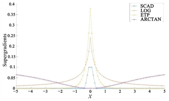 When seeking a solution for Equation (18), the properties of the function can be derived from the gradient (or super-gradient when there is a non-smooth origin point). At the point , if holds for every ; then, is the super-gradient of function . Thus, the function in Equations (17) and (18) has its approximated formulation as , where is sufficiently close to . By using first-order Taylor expansion, represents the gradient of at . The same principle can also be implemented for the penalty function .