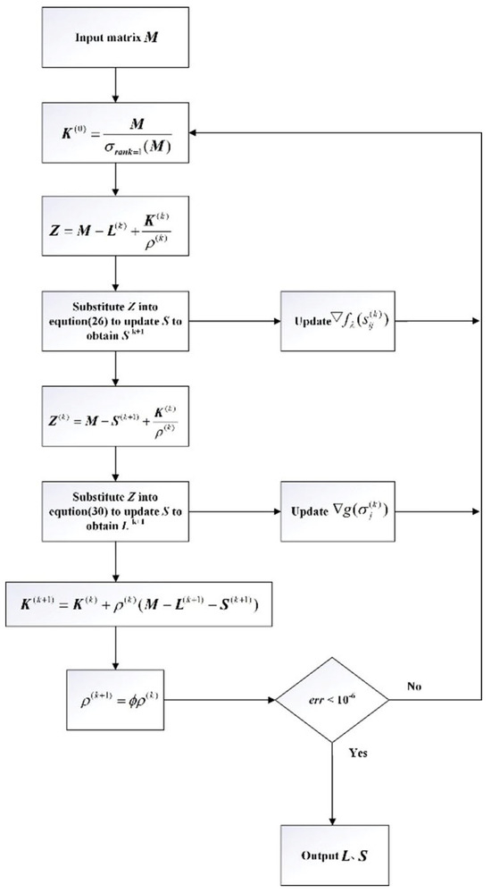 Continuing, the IALM is employed to solve the equation, mainly involving three steps: in the first step, and are fixed, and is updated to find its optimal value. Since is independent of , it can be omitted during the process of solving for . is a constant, and it can also be omitted and scaled while solving for , as follows: