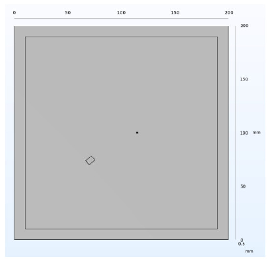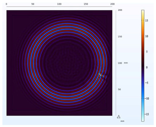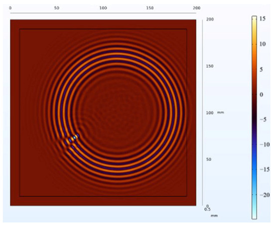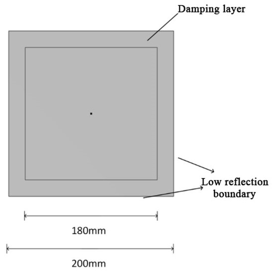 The simulation model of Lamb waves in this paper is developed in the transient acoustic pressure module of the COMSOL Multiphysics® version 6.2 software, which is based on the finite element method. This module is used to solve the control partial differential equations (PDE) for the propagation of sound waves as follows: