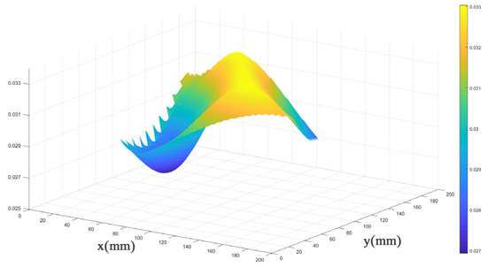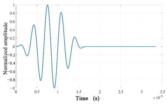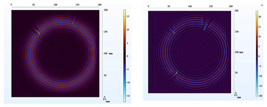 From Figure 3, it can be seen that in the group velocity dispersion curve, within the low-frequency range, there are and modes, and at 3600 kHz, and modes begin to appear; in the phase velocity dispersion curve, and modes appear at low frequencies, and at 3600 kHz, and modes appear. This indicates that for a three-dimensional aluminum plate, only waves of and exist at lower frequencies, while at higher frequencies, different modes of guided waves will appear, leading to mutual interference. In practical applications of structural damage monitoring, to reduce the dispersion and multimode effects of guided waves and simplify signal processing, Lamb waves of a single mode are usually selectively excited in the low-frequency range.