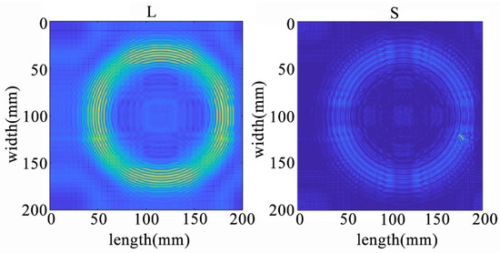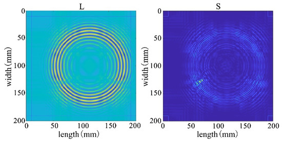 According to the results in Table 6, for the experimental real data, the algorithm designed in Section 4 firstly separates the low-rank matrices with a rank of seven, which possesses a much lower rank and is about three times lower than the traditional method, indicating that it can restore the original data information at a much lower rank level. Secondly, the decomposition error is also significantly reduced by an order of magnitude, and the number of iterations and processing time are also drastically reduced, which greatly improves the real-time monitoring efficiency of SHM. These comprehensive results fully demonstrate the advantages of this paper’s algorithm in several aspects, highlighting the superiority of the improved algorithm in processing full-wavefield experimental data, which not only provides more accurate damage identification but also possesses high monitoring efficiency, providing a reliable solution for applications in the field of structural health monitoring.
