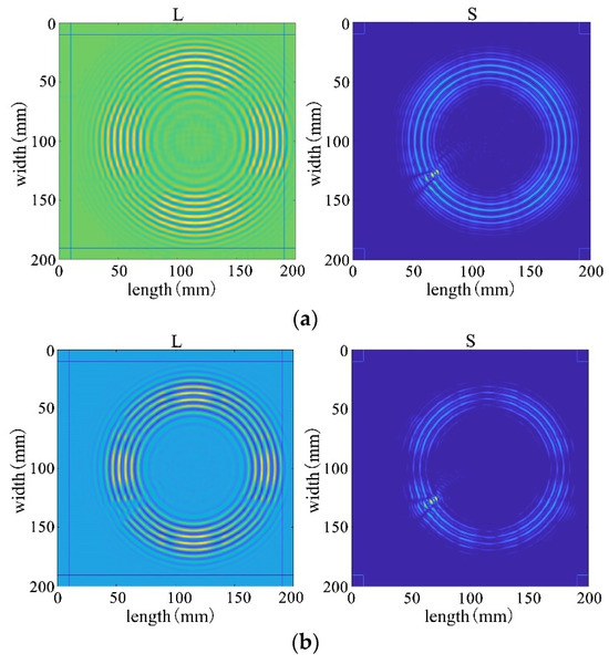 This utilizes the full wavefield image data measured by PSV-400-3D, which is the key to the in-depth study of the real wavefield environment data. The wavefield image data in damage and non-defective cases are extracted respectively, as shown in Figure 32a,b, and processed by different algorithms for comparative analyses to reveal the advantages and disadvantages of the algorithms in dealing with real data.