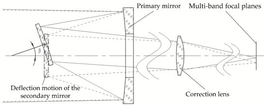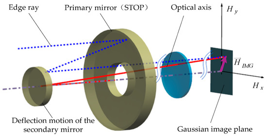 In order to elucidate the operational principle of the secondary mirror in compensating for image motion, it is essential to establish a model of the misalignment optical system and investigate the interrelationship between the deviation vector of the secondary mirror and the misalignment of the secondary mirror. The offset of the image point position of the optical system caused by the movement of the secondary mirror can be determined by tracing the optical axis rays to the image plane [14,15], as illustrated in Figure 3.