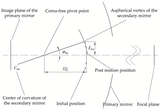In addition, the center of rotation of the secondary mirror is set as the coma-free pivot point. When the tilt of the secondary mirror is small, according to the geometric relationship shown in Figure 4, the eccentricity of the secondary mirror can be simplified as Equation (8).
