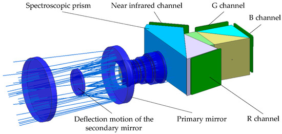 The optical system was designed with a catadioptric structural form, which allowed for the off-axis complication of the secondary mirror. The two-mirror telescope system of the optical system was constructed in the form of an R-C structure [20,21,22,23,24,25]. A correction lens was positioned between the secondary mirror and the focal plane, thereby increasing the field of view of the optical system. The TF3 special glass was employed for the purpose of correcting the secondary spectrum [26,27,28,29]. Through the matching of optical materials and structural materials, the athermalization design of the optical imaging system was realized [30,31,32]. The optical system employed spectroscopic prisms to segregate panchromatic light into four distinct spectral bands, namely R, G, B and NIR, and then imaged them individually. The optical system adopted the multi-dimensional movement of the secondary mirror to achieve comprehensive image-motion compensation of the four spectral bands cameras. The final design results are shown in Figure 5 and Figure 6.