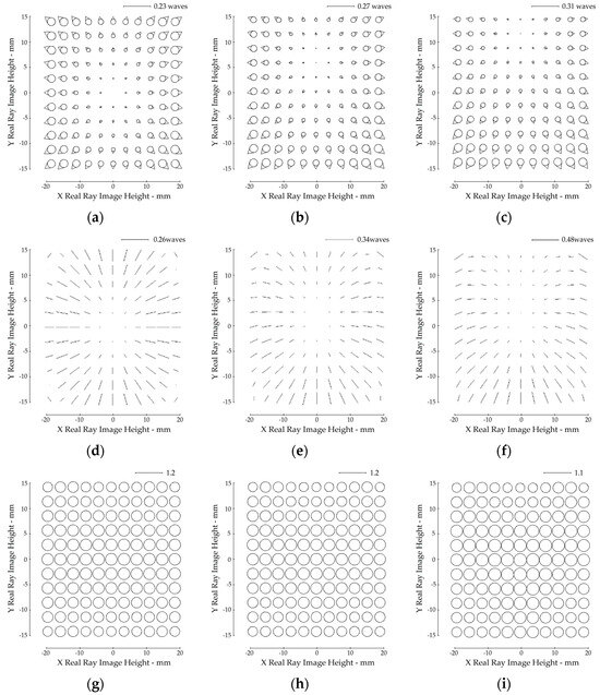 Effect of secondary mirror deflection angle on the aberration field: (a) coma aberration field with 0° deflection angle; (b) coma aberration field with ±0.03° deflection angle; (c) coma aberration field with ±0.05° deflection angle; (d) astigmatic aberration field with 0° deflection angle; (e) astigmatic aberration field with ±0.03° deflection angle; (f) astigmatic aberration field with ±0.05° deflection angle; (g) modulation transfer function with 0° deflection angle; (h) modulation transfer function with ±0.03° deflection angle; and (i) modulation transfer function with ±0.05° deflection angle.