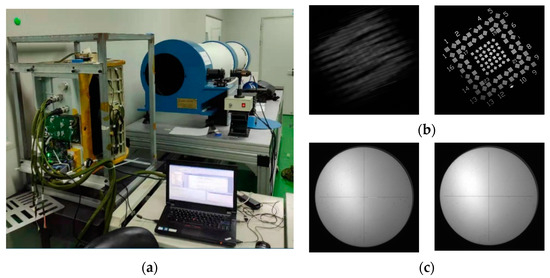 To adequately validate the image-motion compensation capability of the secondary mirror’s image-motion compensation mechanism, an experimental platform was constructed, as illustrated in Figure 8. The instruments used for the image-motion compensation experiment mainly included a collimator and a two-axis scanning platform. By adjusting the pitch and roll scanning rate of the two-axis scanning platform, we accurately simulated the attitude rate of the targets (No. 4 resolution target, cross-target) under different speed-to-height ratios and different scanning rates. Simultaneously, the two-axis image-motion compensation mechanism drove the secondary mirror’s motion to compensate for the image motion caused by the target movement. In the experiments, the two-axis scanning platform was scanned at a velocity of +60°/s for the roll and 5°/s for the pitch.