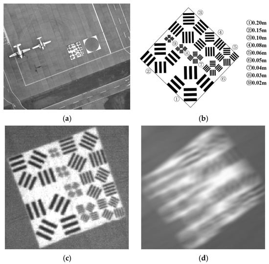 Airport flight experiment: (a) partial image of the flight experiment; (b) original image of the resolution target; (c) zoomed image of the resolution target with the image-motion compensation mechanism turned on; and (d) zoomed image of the resolution target with the image-motion compensation mechanism turned off.