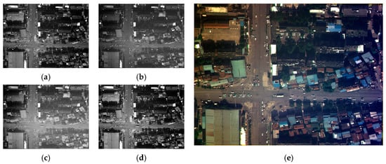 Urban flight experiment imaging results: (a) R-spectral band; (b) G-spectral band; (c) B-spectral band; (d) NIR spectral band; and (e) RGB image fusion.