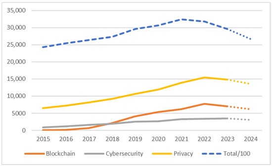 For example, the chart in Figure 1 illustrates publication trends for the selected technology topics from 2015 to 2024 based on Web of Science data. The total publication count, divided by 100 for scale, is also represented.