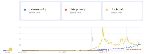 The chart in Figure 2 from Google Trends illustrates the public interest, approximated through the Google Search interest over time for the three technology-related topics: data privacy, blockchain, and cybersecurity, spanning from 2004 to 2024. The data reveals distinct patterns of public interest in these subjects, reflecting the broader societal trends and technological developments.