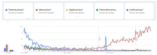The chart in Figure 3 from Google Trends illustrates the evolution of search interest concerning privacy in five privacy-related terms from 2004 to 2024: “internet privacy”, “data privacy”, “digital privacy”, “information privacy”, and “online privacy”. The visualization reveals shifting public concerns and awareness about privacy in the digital age.