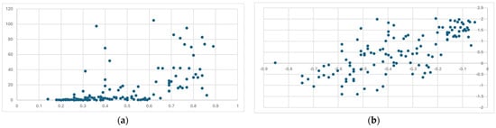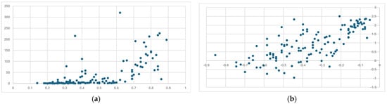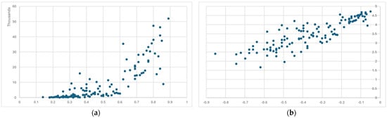 Scatterplots of blockchain publications as a function of AHDI in raw numbers and logarithmic form. The logarithmic transformation permits linear regression modeling. Source: authors’ analysis. (a) The total blockchain publications per million (y-axis) as a function of AHDI (x-axis). (b) The lg10 of the total blockchain publications per million (y-axis) as a function of lg10 AHDI (x-axis).