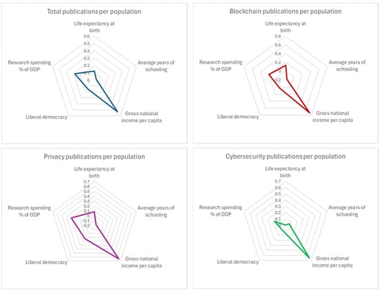 Consistent with the literature, the models confirm the strong positive influence of economic factors on scientific output. The finding that GNI per capita is the strongest predictor across all the examined fields (total publications, blockchain, privacy, and cybersecurity) aligns with numerous studies highlighting the crucial role of a country’s economic resources in fostering scientific productivity.
