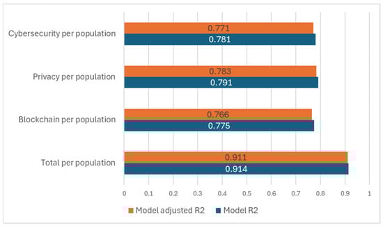 The models for specific technological fields—blockchain, privacy, and cybersecurity—show somewhat lower but still considerable explanatory power. Their R-squared values range from 0.775 to 0.791. The slightly lower R-squared values for the specific fields compared to the total publications suggest that while the chosen variables are still highly relevant, there may be additional factors influencing research output in these areas that are not captured by the model. This could include field-specific elements such as technological infrastructure, industry partnerships, or national priorities in digital innovation.