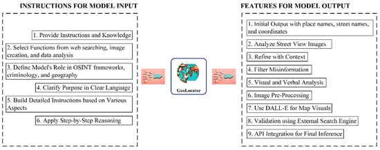 Based on the GPT-4, we have developed a tool capable of inferring location information from images, which we named GeoLocator (https://chat.openai.com/g/g-qxqvMb6YJ-geolocator, accessed on 10 August 2024). GPT-4 is a large multimodal model acceptable for the input of images and texts and emitting text outputs; although it is not capable as a human being in many real-world scenarios, GPT-4 has demonstrated human-level performance on a variety of professional and academic benchmarks. GeoLocator we developed is a customized version of ChatGPT (https://chat.openai.com/gpts/editor, accessed on 10 August 2024). GeoLocator’s strength is to use the powerful feature extraction and linguistic inference capabilities of large multimodal models to infer location information from images. At the same time, we developed GeoLocator with a large number of model commands built in to avoid transferring lengthy contexts each time. As shown in Figure 1, forming the most important core of GeoLocator are the instructions for model input and features for model output.