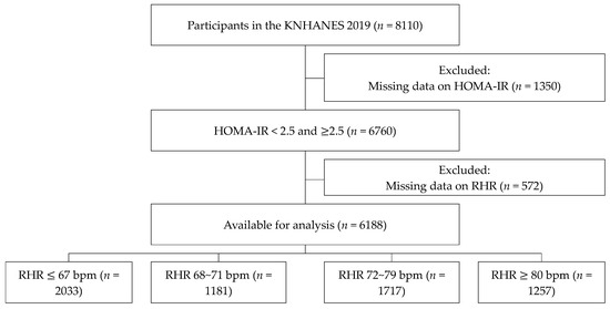 This study was based on KNHANES 2019 data and included 8110 participants. After excluding participants with missing data on HOMA-IR and RHR, 6118 participants were included in the final analysis and categorized according to their RHR: ≤67 bpm (n = 2033), 68–71 bpm (n = 1181), 72–79 bpm (n = 1717), and ≥80 bpm (n = 1257) (Figure 1). The survey and materials were reviewed and approved by the Institutional Review Board of the Korea Disease Control and Prevention Agency.