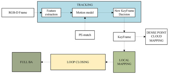 PE-SLAM is an improvement of the ORB-SLAM2 framework, as shown in Figure 2, consisting of the following five modules: “TRACKING”, “LOCAL MAPPING”, “LOOP CLOSING”, “DENSE POINT CLOUD MAPPING”, and “FULL BA”. “TRACKING” focuses on real-time computation of the camera’s motion trajectory by matching features in adjacent image frames. “LOCAL MAPPING” optimizes local poses and constructs local maps in the local scene. “LOOP CLOSING” corrects trajectory drift caused by error accumulation by determining if the camera has returned to a previously visited location. “DENSE POINT CLOUD MAPPING” is used to build dense point cloud maps. “FULL BA” further enhances the system’s accuracy and stability through optimization algorithms.