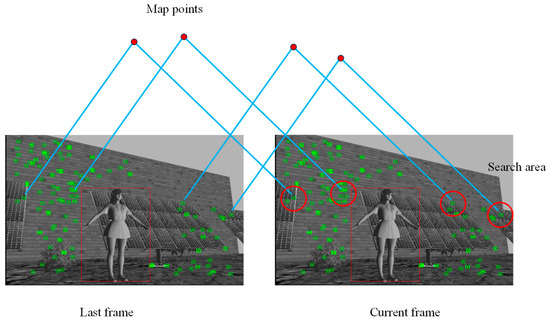 The primary task of tracking in the pose estimation stage is handled by the motion model. As shown in Figure 3, its basic idea is to assume the camera is in uniform motion over a short period, using the pose and velocity estimated from the previous frame to predict the approximate positions of matching feature points between the current frame and the previous frame. A search area is then set around this position for feature descriptor matching, which improves matching speed while ensuring good accuracy. The specific process is as follows: