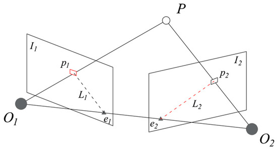 Epipolar constraints [27] reduce the distribution of possible matches of a point on another image from two dimensions to one dimension, providing constraints to weed out false matches. The epipolar constraint schematic is shown in Figure 4; and are the image planes of the camera at two moments, and are the camera centers corresponding to the two image planes, and according to the pinhole camera model, it can be known that and are the 2D pixel points mapped by the spatial point on the two image planes. The ray has a spatial point corresponding to pixel , and the projection of this ray on the image plane is the epipolar line , the pixel point of projected on the image plane must be on the epipolar line , and matching must be on the epipolar line.