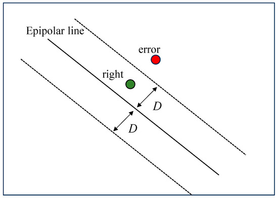 The distance from the pixel to be verified to is calculated using the point-to-straight line distance, and if the distance is within a certain threshold, then the pixel is identified as the correct match for . As shown in Figure 5, if it is not within the threshold then this matched point pair is rejected.