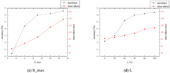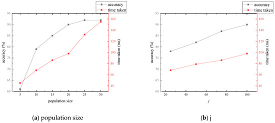 Random sampling is contrasted with the particle swarm optimization sampling discussed herein. To ensure fairness in performance comparison, the PE-match’s inner point distance threshold is set to three. Based on multiple experimental results, the near-optimal parameter settings for the particle swarm are determined: the population size is set to 20, which influences the search capability of the particle swarm algorithm, though an excessively high number can reduce the algorithm’s real-time performance. The number of differences is set to three, influencing the mutation strategy’s sensitivity to differences among particles. The crossover probability is set to 50%, determining the influence of the mutation strategy on . The learning weights for individual and global extrema and are both set to 0.5, while the inertia weight is also set to 0.5. The number of matching point pairs involved in fitness calculation is set to 100; this value allows the particle swarm algorithm to maintain real-time performance without degrading despite an increase in feature points, though setting it too low can diminish the optimization capability. The iteration ends, and the optimal fundamental matrix is output if there are no significant changes in over 8 () iterations, a measure included to ensure the stability of the algorithm’s real-time performance. Taking the 1–4 matching experiments of Scene 1 from the OxfordVGG dataset as an example, Figure 9 illustrates the influence of key parameters on the algorithm’s accuracy and processing time. For different matching scenarios, this paper will make minor adjustments based on the aforementioned parameters to adapt to varying conditions. Because the outcomes of the particle swarm optimization are related to the number of iterations and the initial distribution of particles, subsequent experimental data related to this algorithm will be the averages of multiple trials.